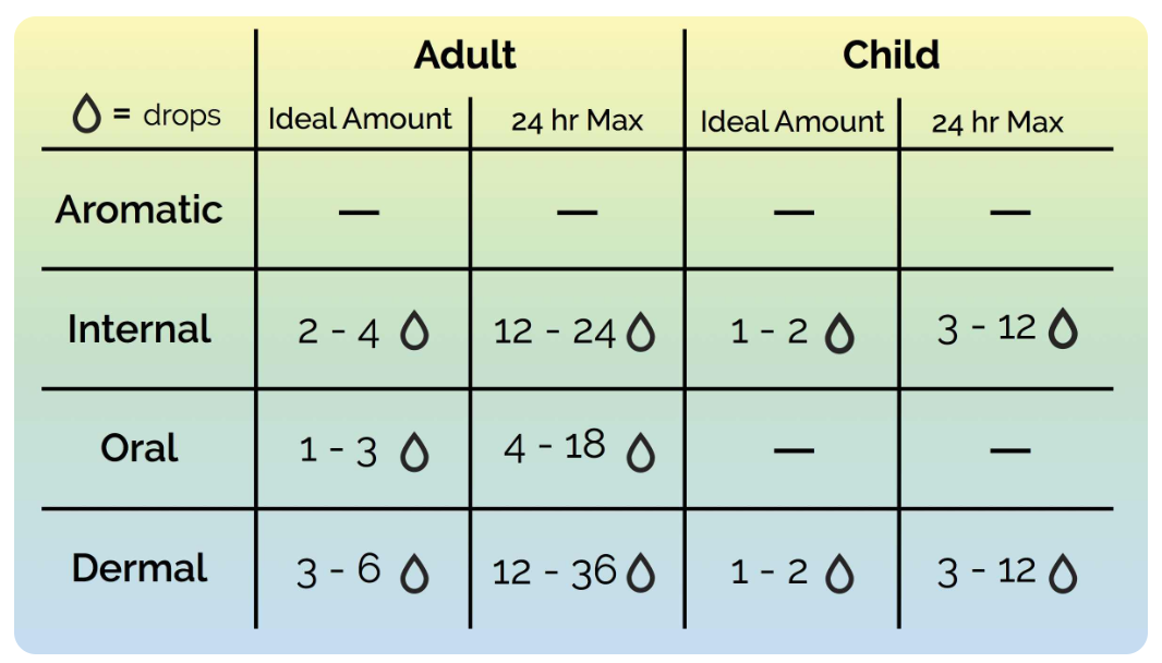 Keep in mind, these guidelines are intended as a starting point for individuals using essential oils for the first time. Many people use more drops per day than this with no unwanted effects, but as you begin using oils this will help guide your usage so that you’re not swinging too far into either of the groups we just talked about. ?